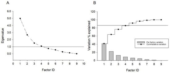 Exploratory factor analysis applied to variables generated from open field paradigm data (see Supplementary Table S1). Principal component-based factor extraction method with subsequent varimax orthogonal rotation was used to derive factor loadings on variables. (A) Number of factors derived from the screen plot analysis; an eigenvalue of 1 has been used as a principal factor definition threshold. (B) Percentage of variation explained by a specific factor (bar graph) and cumulative variation explanation percentage (splay lines). No secondary factors were detected upon oblique rotation application.