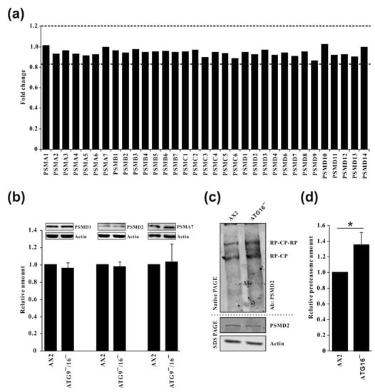 Analysis of the abundance of all 26S proteasomal subunits revealed no significant differences between AX2 wild-type and the single ATG9 and ATG16 knock-out cells (Figure S1a,b) or the ATG9/16 double knock-out cells (Figure 1a). We confirmed the result for the double knock-out strain for PSMD1and PSMD2 from the 19S regulatory particle and for PSMA7 from the 20S catalytic particle by Western blotting (Figure 1b). Next, we analyzed proteasome abundance in AX2 wild-type and ATG16− strains by native PAGE and Western blotting. The results suggest a moderate increase of approximately 30% of fully assembled 26S proteasomes in ATG16− cells in comparison to AX2 wild-type cells (Figure 1c,d). We obtained similar results for ATG9− and ATG9−/16− cells.