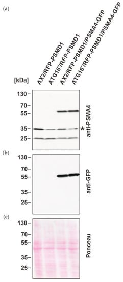 Verification of the expression of PSMA4-GFP in the different mutant strains by immuno-blotting. (a) Immunoblotting of total cell lysates of AX2/RFP-PSMD1, ATG16−/RFP-PSMD1, AX2/RFP-PSMD1/PSMA4-GFP, and ATG16−/RFP-PSMD1/PSMA4-GFP strains. Endogenous PSMA4 and PSMA4-GFP were detected with the PSMA4 mAb []; * cross-reaction of the antibody. (b) The tagged PSMA4 in the AX2/RFP-PSMD1/PSMA4-GFP and ATG16−/RFP-PSMD1/PSMA4-GFP strains was detected with the GFP mAb []. (c) Ponceau stain of the blotting membrane as a loading control.