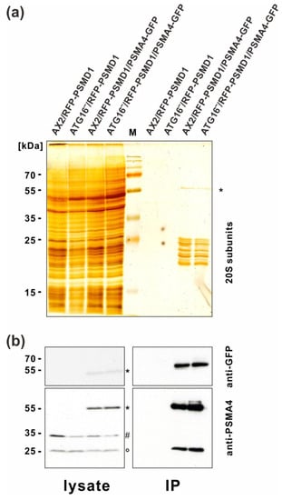 Analysis of GFP-trap immunoprecipitations. (a) Silver stain of total cell lysates (left) and of immune precipitates (right) of AX2/RFP-PSMD1, ATG16−/RFP-PSMD1, AX2/RFP-PSMD1/PSMA4-GFP, and ATG16−/RFP-PSMD1/PSMA4-GFP strains. The positions of PSMA4-GFP (*) and of 20S proteasomal subunits are indicated. (b) Immunostaining of total cell lysates (left) and of immune precipitates (right) of AX2/RFP-PSMD1, ATG16−/RFP-PSMD1, AX2/RFP-PSMD1/PSMA4-GFP, and ATG16−/RFP-PSMD1/PSMA4-GFP strains. Top panel: anti-GFP immunoblot. Bottom panel: anti PSMA4 immunoblot. The positions of PSMA4-GFP (*) and of PSMA4 (°) are indicated. (#): Cross-reaction of the PSMA4 mAb. M: Low molecular weight protein marker.