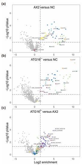 The comparison of co-precipitated proteins in the ATG16−/RFP-PSMD1/PSMA4-GFP versus AX2/RFP-PSMD1/PSMA4-GFP samples revealed forty-four enriched proteins. Of these forty-four proteins, four were also enriched in the comparison of ATG16−/RFP-PSMD1/PSMA4-GFP versus negative control, and the other 40 were exclusive to the former comparison (Figure 4c, lilac circles; Table S3). Their exclusive enrichment in the precipitated samples of ATG16−/RFP-PSMD1/PSMA4-GFP versus AX2/RFP-PSMD1/PSMA4-GFP cells is caused by their underrepresentation in the precipitated proteasomes from AX2/RFP-PSMD1/PSMA4-GFP cells. The ID of those proteins, which are at least 8-fold enriched in ATG16− versus AX2, is provided in Figure 4c.