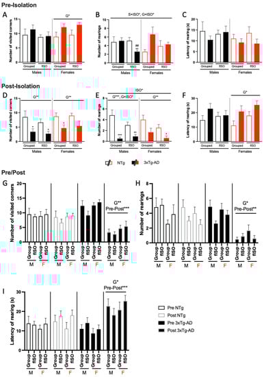 Pre- and post-isolation longitudinal behavioral assessment in the corner test for neophobia. Pre-isolation test: horizontal activity (A) and vertical activity (B,C). Post-isolation test: horizontal activity (D) and vertical activity (E,F). Comparison between pre- and post-test in horizontal activity (G) and vertical activity (H,I). N = 7–10 mice per group, mean ± SEM. Genotype: G*, p ≤ 0.05; G**, p ≤ 0.01; G***, p ≤ 0.001. Forced isolation: ISO*, p ≤ 0.05. Interaction sex and isolation: S × ISO* p ≤ 0.05. Interaction genotype and isolation: G × ISO* p ≤ 0.05. Pre- and post-differences: Pre-Post**, p ≤ 0.01; Pre-Post***, p ≤ 0.001. Differences between two counterparts, genotype: * p ≤ 0.05, ** p ≤ 0.01, *** p ≤ 0.001 vs. NTg counterpart; isolation: ## p ≤ 0.01 vs. grouped counterpart.