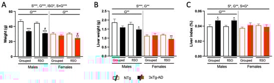 Physical status: Body (A) and liver (B) weights and liver index (C). N = 7–10 mice per group, mean ± SEM. Sex: S*, p ≤ 0.05; S***, p ≤ 0.001. Genotype: G**, p ≤ 0.01; G***, p ≤ 0.001. Forced isolation: ISO*, p ≤ 0.05. Interaction sex and genotype: S × G* p ≤ 0.05; S × G*** p ≤ 0.001. Differences between two counterparts, genotype: * p ≤ 0.05, ** p ≤ 0.01, *** p ≤ 0.001 vs. NTg counterpart; isolation: # p ≤ 0.05 vs. grouped counterpart.