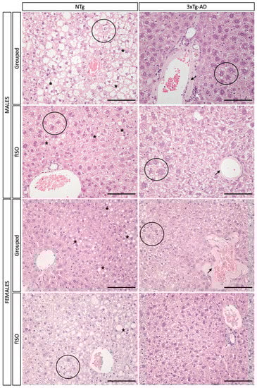 H&E staining of liver tissue. Morphological and structural comparison of liver tissue in NTg and 3xTg-AD males and females grouped and those submitted to forced isolation. H&E stained. Symbols indicate the morphological features as follows: *—steatosis; black arrow—amyloidosis; white arrow—inflammatory infiltration; black circle—ballooning. The images were taken with ×20 objective lens.