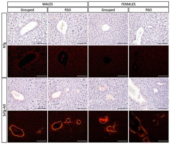 Congo red staining of liver tissue. Differences in vascular parenchyma of liver tissue in NTg and 3xTg-AD males and females grouped and those submitted to forced isolation. Congo red stained. The images were taken with ×20 objective lens; magnification bar = 100 μm.