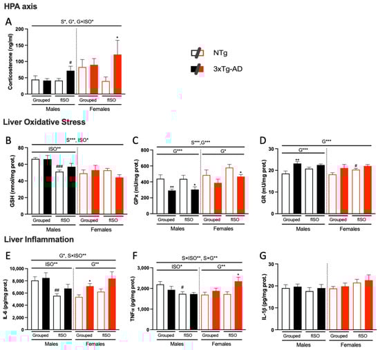 Biochemical analysis of the liver–brain and HPA axis. Corticosterone levels in serum (A). Total levels of GSH in the liver (B). Enzymatic activity of GR and GPx (C,D, respectively). Pro-inflammatory cytokines levels of IL-6 (E), TNF𝛼 (F), and IL-1𝛽 (G). N= 7–10 mice per group, mean ± SEM. Sex: S*, p ≤ 0.05; S***, p ≤ 0.001. Genotype: G*, p ≤ 0.05; G**, p ≤ 0.01; G***, p ≤ 0.001. Forced isolation: ISO*, p ≤ 0.05; ISO**, p ≤ 0.01. Interaction effects: sex and genotype: S × G**, p ≤ 0.01; sex and isolation: S × ISO**, p ≤ 0.01; sex and genotype: S × G**, p ≤ 0.01. Differences between two counterparts, genotype: * p ≤ 0.05, ** p ≤ 0.01 vs. NTg counterpart; isolation: # p ≤ 0.05, ## p ≤ 0.01, ### p ≤ 0.001 vs. grouped counterpart. G × ISO*, p ≤ 0.05.