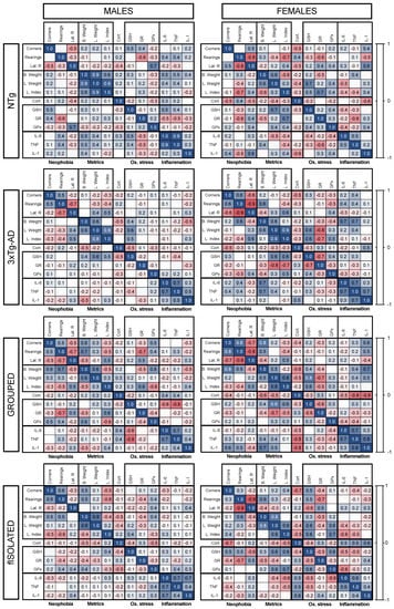 The correlations between the functional variables, namely, behavioral phenotype, physical status, HPA axis, liver oxidative stress, and liver inflammation, were determined using Pearson’s test, considering the two intrinsic (genotype and sex) and extrinsic (isolation) factors. The data are shown as a heat map with correlation coefficients. The most important relationships with biological meaning are shown in scatter plots.