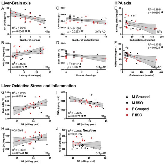 Scatter plot representing the most biologically relevant correlations: GR activity and number of rearings by NTg animals (A); GPx activity and latency of rearings by NTg animals (B); liver index and number of corners visited by 3xTg-AD animals (C); liver index and number of rearings by 3xTg-AD animals (D); latency of rearing and corticosterone levels in NTg animals (E); GSH levels and corticosterone leves in 3xTg-AD animals (F); liver index and GR activity in NTg animals (G); TNF𝛼 levels and GR activity in NTg animals (H); GPx activity and GR activity in NTg animals (I); GPx activity and GR activity in 3xTg-AD animals (J). N = 6–10 mice per group, each linear regression includes the correlation index (R2) and the level of significance of the correlation (p), * p ≤ 0.05, ** p ≤ 0.01.