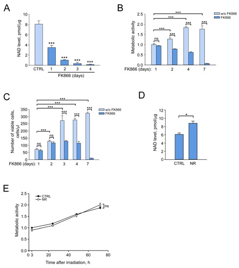 Furthermore, in order to increase the concentration of intracellular NAD, we used NR, the nucleoside form of vitamin B3. NR stimulates an alternative NAD biosynthesis pathway via its phosphorylation by NR kinases (NRK) to yield NMN [56] (Figure S1), and is currently one of the most widely used NAD boosting agents in various cellular and animal experimental models [57,58]. HDF were cultured in the presence of NR (at a concentration of 150 µM) for 24 h, then the concentration of NAD in the cell extract was determined. Stimulation of NAD synthesis by NR resulted in a significant increase (more than 40%) in NAD level compared to control cells (Figure 1D). At the same time, the presence of NR in the growth medium had no effect on the metabolic activity of irradiated cells (Figure 1E).