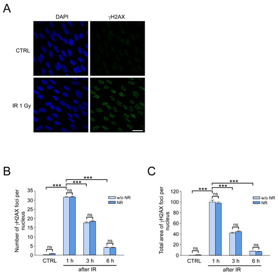 The effect of the stimulation of NAD biosynthesis on γH2AX foci formation and elimination in IR-exposed HDF. HDF were treated with ionizing radiation (IR) at a dose of 1 Gy. Cells were fixed at different time points after IR (as indicated) and stained for γH2AX. (A) γH2AX foci 1 h after IR visualized by immunofluorescence (green). Cell nuclei were counterstained with DAPI (blue). Scale bar, 30 µm. (B,C) Cells were pretreated with NR for 24 h before IR. NR was also present in the culture medium after IR. γH2AX foci were quantified 1 h, 3 h, and 6 h after IR. The number (B) and relative total area (C) of γH2AX foci per nucleus. The total area of γH2AX foci induced in cells untreated with NR, 1 h after IR, was taken as 100%. Data are presented as mean ± standard error (SE) (n = 200). Statistical analysis of differences between the groups was carried out by one-way ANOVA with post hoc comparisons using Tukey test. *** indicates statistically significant difference at p < 0.001. ns indicates that statistical difference is not significant. CTRL marks unirradiated control cells.