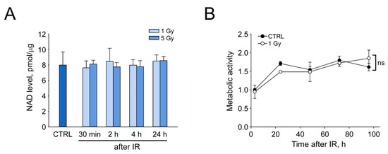 To elucidate how the exposure to IR can influence the cellular NAD content, we treated HDF with IR at a dose of 1 Gy or 5 Gy and measured NAD level in cell extracts at various time intervals. NAD concentration in control cells was about 8 pmol/µg and remained unchanged at 0.5, 2, 4, and 24 h after IR at both doses (Figure 3A). Furthermore, differences in metabolic activities of NAD(P)H-dependent dehydrogenases estimated by MTT assay were indistinguishable between irradiated and control cells (Figure 3B and Figure S3). Thus, IR at moderate doses does not induce any depletion of NAD in HDF.
