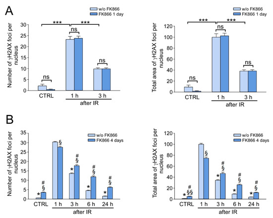 Next, we intended to clarify how the depletion of the NAD pool by the NAMPT inhibitor, FK866, could affect the efficiency of DNA DSB repair. HDFs were irradiated at a dose of 1 Gy and incubated in the medium containing FK866 for 1 or 4 days, then the number of γH2AX foci and the total area of foci per nucleus were estimated in treated and untreated cells as described in Section 3.2. As a result of a 1-day treatment with FK866, there was a decrease in intracellular NAD level by 50% compared to that in control cells (Figure 1A), but the number and the total area of γH2AX foci per nucleus did not change 1 h and 3 h after IR treatment (Figure 4A). Thus, a mild decrease in the NAD pool did not affect both the induction and the elimination of DNA DSB. After 4 days of treatment with FK866, intracellular NAD was hardly detectable in HDF (Figure 1A). This resulted in less efficient IR-induced γH2AX foci formation—their number per nucleus 1 h after IR was 10% less (Figure 4B, left panel)—and the total area dropped by 25% (Figure 4B, right panel) compared to untreated cells. Surprisingly, despite the almost complete depletion of NAD, the elimination of γH2AX foci was observed at 3, 6, and 24 h after IR, but it was less effective than in FK866-untreated cells (Figure 4B). These results indicated that under conditions of critical NAD depletion, HDF retained the ability to eliminate DNA DSB, but the DSB repair capacity was decreased in comparison to cells with normal NAD levels.