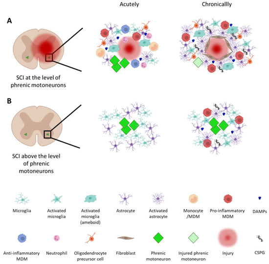 Immune response and cellular reorganization at the level of phrenic motoneurons following a traumatic cervical spinal cord injury (SCI). SCIs lead to cascades of cellular and molecular events both acutely and chronically after an injury. (A) When an injury occurs at the level of phrenic motoneurons (phMNs), well-known inflammatory processes occur (see the reviews in [19,33,34,35,36]). In this situation, phMNs are not only directly impacted by the injury, but are exposed to secondary inflammation, which can place them at risk of damage and/or death. (B) Even with an injury occurring rostral to phMNs, they are denervated and do not receive input from brainstem neurons within the ventral respiratory column (VRC). When they are only denervated, however, they typically survive and remain recruitable when spontaneous or therapeutically induced repair processes occur. MDM: monocyte-derived macrophage; DAMPs: damage-associated molecular patterns; CSPG: chondroitin sulfate proteoglycan. The figure was created with BioRender.com.