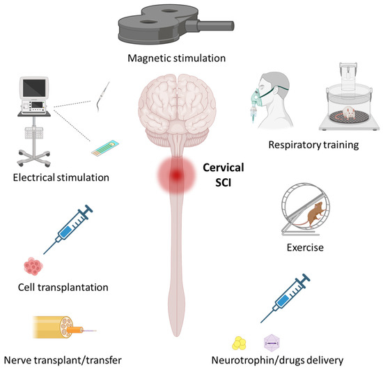 Therapeutics aimed at promoting respiratory recovery following traumatic cervical spinal cord injury (SCI). Various therapeutics have been developed to induce neuroplasticity in the phrenic motor system to promote respiratory recovery. Some of the most extensively studied are detailed in the present review and involve the following: activity-based therapeutics, such as respiratory training and exercise; stimulation-based therapeutics, such as invasive electrical stimulation and non-invasive magnetic stimulation; therapeutics for promoting axonal growth and neuroprotection, such as nerve transfer, cell transplantation, and neurotrophin/drug delivery. The figure was created with BioRender.com.