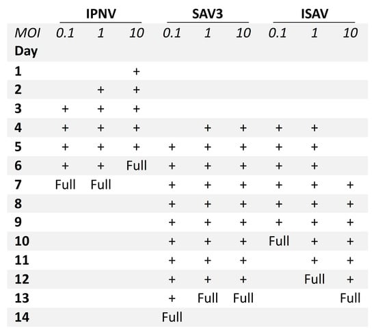 A difference was observed between the occurrence of CPE relative to the MOIs used. For IPNV, increasing the MOI resulted in an earlier onset of CPE (Figure 2). At MOI 10, CPE was observed at 1 dpi, while for MOI 1 and 0.1, CPE was first observed at 2 dpi and at 3 dpi, respectively. IPNV infection progressed rapidly reaching full CPE at 6 dpi for MOI 10, and by 7 dpi at MOIs 1 and 0.1. At 3 dpi, the samples for qPCR were collected and CPE is shown in Figure S1. For SAV3, CPE was first observed at 4 dpi for MOIs 10 and 1, and by 5 dpi for MOI 0.1 (Figure 2). The infection was more protracted for SAV3 than for IPNV, with full CPE reached at 13 dpi for MOI 10 and 1, and by 14 dpi for MOI 0.1. For SAV3, at 5 dpi when the samples for qPCR were collected, CPE is shown in Figure S2. In contrast to IPNV and SAV3, ISAV induced CPE earlier for MOI 0.1 and 1 (at 4 dpi) than for MOI 10 (at 7 dpi) (Figure 2). Correspondingly, full CPE was reached first for MOI 0.1 at 10 dpi, by 12 dpi for MOI 1 and 13 dpi for MOI 10. qPCR samples were collected at 5 dpi with CPE documented in Figure 3.