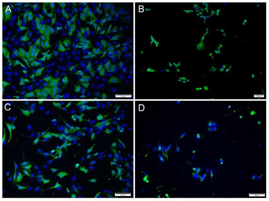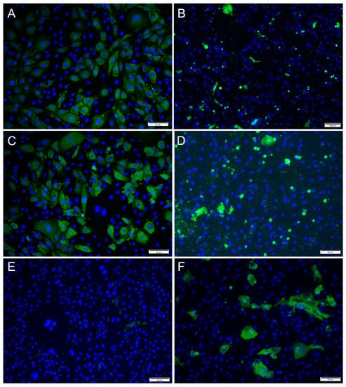 Immunofluorescence antibody staining was used to demonstrate a viral infection in RTgutGC cells at different dpi and at different MOIs. While no viral antigens were detected in the control cells for any of the viral antibodies, positive staining was detected in the infected cells. IFAT staining for IPNV, at 2 dpi and at MOI 1 and 10, showed strong staining in more than 50% of the cells (Figure 4A,C). At MOI 10, cell density was reduced (as a consequence of infection), and cell morphology was affected by the virus infection with more elongated cells being observed. At 7 dpi, for MOIs 1 and 10, cells were mostly lysed, and the remaining cells stained positive (Figure 4B,D).