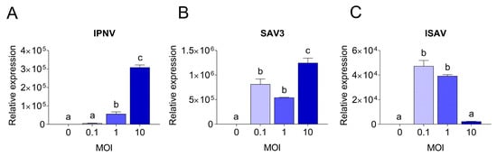Quantitative PCR results showing viral yields in RTgutGC cells. Infection with IPNV (A), SAV3 (B) and ISAV (C) at MOI 0.1, 1 or 10, and in uninfected cells (MOI = 0). For IPNV, cells were harvested at 3 dpi, while for SAV3 and ISAV, cells were harvested at 5 dpi. Letters indicate significant differences between different MOI.