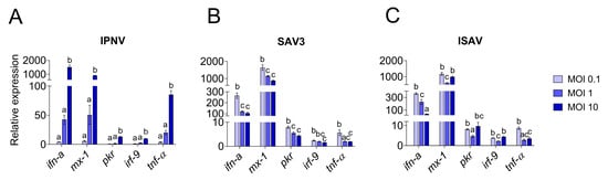 Quantitative PCR expression of antiviral response genes in RTgutGC cells. Infection with IPNV (A), SAV3 (B) and ISAV (C) at MOI 0.1, 1 or 10. Gene expressions are given as relative values to the control group (=1). Letters indicate significant differences between the different MOI where the letter a is insignificant from control.