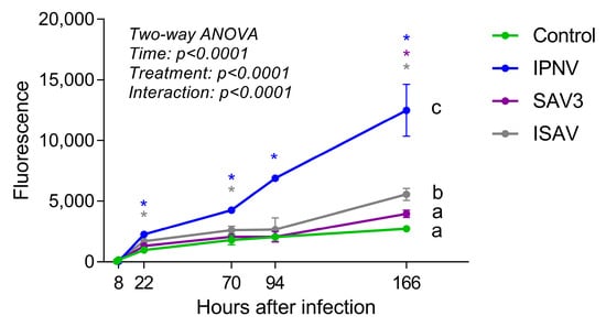 Barrier permeability assay with fluorescent bovine serum albumin (BSA). Cells were incubated with virus (IPNV and SAV3, MOI 1; ISAV, MOI 0.1) for 6 h, fluorescent BSA was then added to the apical well side and samples taken from the basolateral side at different time points. Different letters indicate significant differences between treatments (Tukey’s multiple comparison test). Stars indicate significant differences from control wells for each time point (Dunnett’s multiple comparison test).