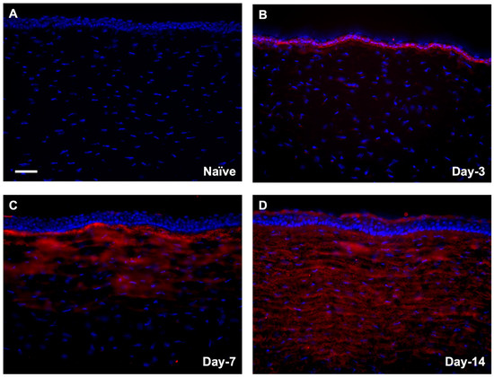 SM-exposed corneas had increased immunostaining of αSMA expression in the corneal stroma in a time-dependent manner. Day-3 corneas had minimal αSMA staining (Figure 2B), which increased significantly on day 7, and day 14. In addition, day-7 had αSMA staining localized in the anterior stroma (Figure 2C), whereas day-14 had αSMA staining throughout the corneal stroma (Figure 2D) compared to the naïve group (Figure 2A).