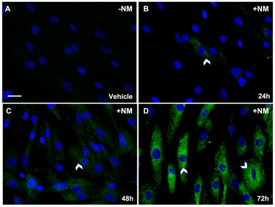 Representative ICC images show time-dependent expression of αSMA in hCSF −/+ NM. NM vapor caused a time-dependent increased expression of αSMA in corneal fibroblasts over 72 h. Low αSMA expression was denoted by weak positive staining at 24 h ((B); 10% of cells) and 48 h ((C); 55% of cells) post-NM treatment. Intense positive staining represents an increase in αSMA at 72 h ((D); 90% of cells) post-NM compared to hCSF with vehicle only ((A); 0% of cells). αSMA was stained with GFP (green), and cell nuclei are stained with DAPI (blue). (White arrow heads = ɑSMA; Scale bar = 50 µM; n = 3).