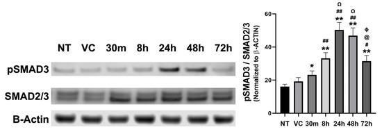 hCSFs treated with NM had a significant increase in the phosphorylated SMAD3 to total SMAD (pSMAD3/SMAD2/3) ratio at 30 m (23.13%% ± 2.4; p < 0.001), 8 h (33.19% ± 3.4; p < 0.0001), 24 h (50.33%% ± 4.5; p < 0.0001), 48 h (46.86% ± 4.7; p < 0.0001), and 72 h (31.49% ± 3.4; p < 0.0001) compared to NT (16.11% ± 1.4; p < 0.001) and VC (19.24% ± 2.3; p < 0.0001) (Figure 4). A significant increase at 8 h (p < 0.0001), 24 h (p < 0.0001), 48 h (p < 0.0001), and 72 h (p < 0.001) compared to 30 m. There was a significant increase at 24 h (p < 0.0001) and 48 h (p < 0.0001) compared to 8 h and a significant decrease at 72 h (p < 0.0001) compared to 24 h and 48 h (Figure 7).