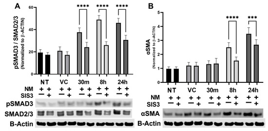 Next, we pretreated hCSFs with SIS3, a SMAD3-specific inhibitor, to study the functional role of SMAD signaling in myofibroblast formation. SIS3 significantly reduced the pSMAD3/total SMAD ratio compared to NM only at 30 m (22.11% ± 3.8 vs. 33.75% ± 3.5; p < 0.0001), 8 h (23.72% ± 2.7 vs. 43.60% ± 3.3; p < 0.0001), and 24 h (27.75% ± 3.7 vs. 41.12 ± 3.6; p < 0.0001) (Figure 8A). The decrease in the pSMAD/SMAD2/3 ratio was correlative to ɑSMA expression changes. SIS3 significantly reduced ɑSMA expression compared to NM only at 8 h (1.59 ± 0.27 vs. 2.57 ± 0.34; p < 0.0001) and 24 h (2.76 ± 0.37 vs. 3.56 ± 0.45; p < 0.001) (Figure 8B).