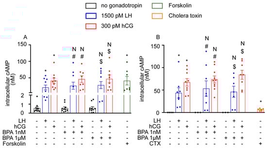 Effect of BPA on cAMP production in vitro: (A) in human granulosa cells (hGLC); (B) in mouse Leydig cells (mLTC1). cAMP was measured using an HTRF assay. Forskolin and cholera toxin served as the positive control in hGLC and mLTC1 cells, respectively. Data are represented as mean ± SEM. CTX = cholera toxin. *, Significantly different vs. “no gonadotropin” alone; # vs. “no gonadotropin” + BPA 1 nM; $ vs. “no gonadotropin” + BPA 1 µM; N, not significantly different vs. LH/hCG treatment in the absence of BPA (Kruskal–Wallis test, p ≥ 0.05).