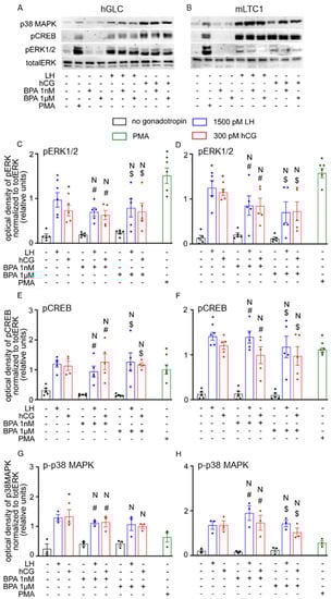Effect of BPA on activation of pERK, pCREB and p38MAPK: Western blotting analyses in hGLC (A) and in mLTC1 (B) after exposure to BPA without or with hCG or LH. Relative semi-quantification of the activation of pERK (C,D), pCREB (E,F) and p38MAPK (G,H) in hGLC and mLTC1 cells, respectively. Data are represented as mean ± SEM. *, Significantly different vs. “no gonadotropin” alone; # vs. “no gonadotropin” + BPA 1 nM; $ vs. “no gonadotropin” + BPA 1 µM; N, not significantly different vs. LH/hCG treatment in the absence of BPA (Kruskal–Wallis test, p ≥ 0.05).