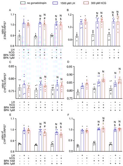 Effect of BPA on steroidogenic gene expression in hGLC after 8 h (A,C,E) and 24 h (B,D,F) of treatment. Genes: STARD1 (A,B), CYP17A1 (C,D) and CYP19A1 (E,F). Data are represented as mean ± SEM. *, Significantly different vs. “no gonadotropin” alone; # vs. “no gonadotropin” + BPA 1 nM; $ vs. “no gonadotropin” + BPA 1 µM; N, not significantly different vs. LH/hCG treatment in the absence of BPA (Kruskal–Wallis test, p ≥ 0.05).