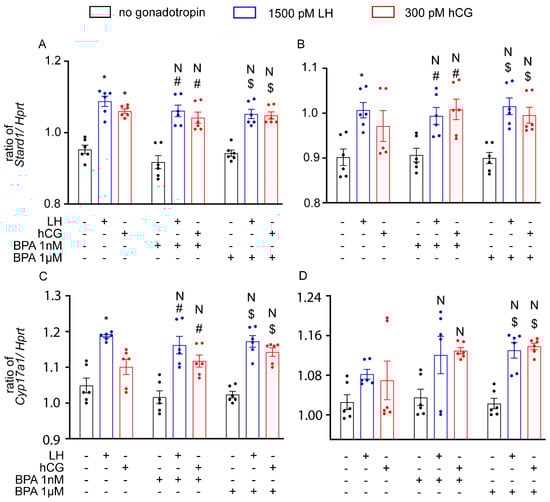 Effect of BPA on steroidogenic gene expression in mLTC1 after 8 h (A,C) and 24 h (B,D). Genes: Stard1 (A,C) and Cyp17a1 (B,D). Data are represented as mean ± SEM. *, Significantly different vs. “no gonadotropin” alone; # vs. “no gonadotropin” + BPA 1 nM; $ vs. “no gonadotropin” + BPA 1 µM; N, not significantly different vs. LH/hCG treatment in the absence of BPA (Kruskal–Wallis test, p ≥ 0.05).