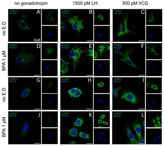 We also investigated the effect of BPA on StAR protein expression, as a key regulator of steroidogenesis. hGLC and mLTC1 cells were treated for 24 h by LH/hCG, in the presence or in the absence of BPA, and the StAR protein was evaluated using immunostaining. As expected, gonadotropins treatments increased the cytoplasmic levels of StAR immunoreactivity (Figure 5A–C). However, in line with our gene expression data, no changes were induced by BPA co-treatments (Figure 5D–F,J,L).