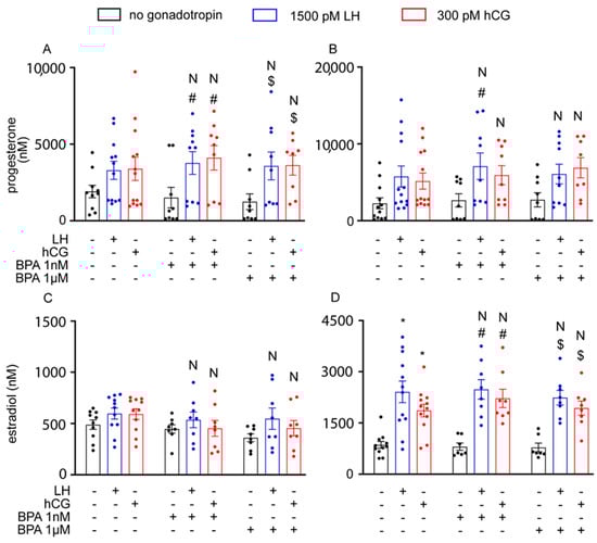 The effect of BPA on progesterone and oestradiol levels in hGLC cells after 8 h (A,C) and 24 h (B,D). Data are represented as mean ± SEM. *, Significantly different vs. “no gonadotropin” alone; # vs. “no gonadotropin” + BPA 1 nM; $ vs. “no gonadotropin” + BPA 1 µM; N, not significantly different vs. LH/hCG treatment in the absence of BPA (Kruskal–Wallis test, p ≥ 0.05).