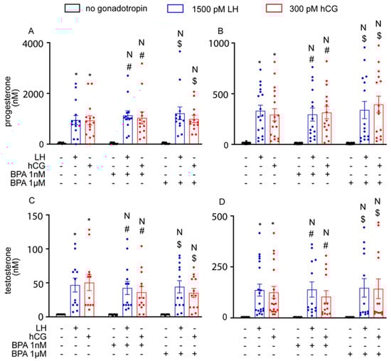 The effect of BPA on progesterone and testosterone levels in mLTC1 cells after 8 h (A,C) and 24 h (B,D). Mean ± SEM. *, Significantly different vs. “no gonadotropin” alone; # vs. “no gonadotropin” + BPA 1 nM; $ vs. “no gonadotropin” + BPA 1 µM; N, not significantly different vs. LH/hCG treatment in the absence of BPA (Kruskal–Wallis test, p ≥ 0.05).