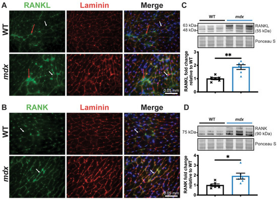 RANKL and RANK expressions are upregulated in dystrophic cardiac tissue. The heart tissues were sectioned and RANKL (A) and RANK (B) expressions were visualized using immunohistochemistry at 40× magnification. Laminin (red) and DAPI (blue) were used to label the cardiomyocyte membrane and nuclei, respectively. RANKL and RANK expression at the cell membrane and in the cardiomyocyte microenvironment are indicated by the white and red arrows, respectively (A,B). RANKL and RANK protein levels were analyzed using western blotting (C,D, respectively). The scale bar in A and B represents 0.05 mm. The results are expressed as means ± SEM (* p < 0.05, ** p < 0.01). An unpaired two-tailed Student’s t-test, with n = 6 for the WT and n = 6 for the mdx, for western blots was performed.