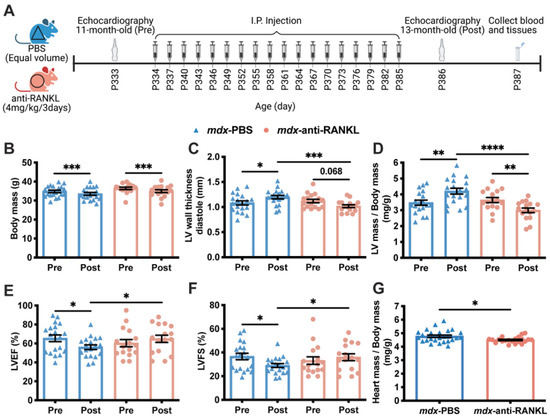 To determine whether the inhibition of RANKL/RANK signaling affects dystrophic cardiac muscle function, the mdx mice were treated with an anti-RANKL for 2 months starting at 11 months of age, at the onset of cardiac dysfunction. The mdx mice were randomized into two experimental groups: PBS or anti-RANKL (4 mg/kg/3d) (Figure 3A and Table S2). Although the body mass decreased between 11 and 13 months of age in the two experimental groups, it was similar in both groups at 11 (pre-treatment, Pre) and 13 months (post treatment, Post) of age (Figure 3B). The small loss in weight observed in the control and treatment groups was most likely due to the repeated injections (1 injection/3d, 18 injections in total), which may have been stressful for the mice.