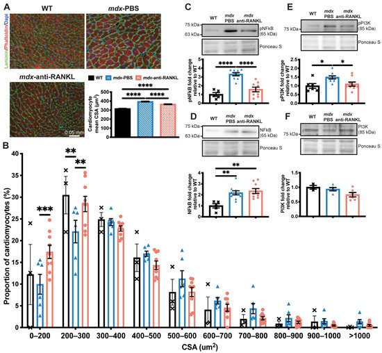 An anti-RANKL treatment reduces the cardiomyocyte surface and inhibits cardiac hypertrophy mediators in dystrophic mice. The heart tissues were sectioned and were incubated with laminin (green), rhodamine-phalloidin (red), and DAPI (blue) markers to label the cardiomyocyte membrane, F-actin filaments, and nuclei, respectively, at 20× magnification (A). The cardiomyocyte mean cross-sectional area (CSA) (A) and CSA distribution (B). Western blot analyses of pNFκB (C), NFκB (D), pPI3K (E), and PI3K (F) protein levels. The scale bar in A represents 0.05 mm. Results are expressed as means ± SEM (* p < 0.05, ** p < 0.01, *** p < 0.001, and **** p < 0.0001). Shown are an analysis of variance one-way ANOVA with a Tuckey correction for the CSA and western blots (A,D–F), and an analysis of variance two-way ANOVA with a Bonferroni correction for a distribution analysis (B). N = 3 for WT, n = 6 for mdx-PBS, and n = 9 for mdx-anti-RANKL for the cardiomyocyte CSA (A) and distribution (B). N = 3–6 for WT, n = 5–10 for mdx-PBS, and n = 5–9 for mdx-anti-RANKL for the western blots (C–F).