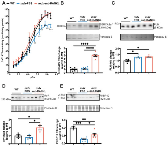An anti-RANKL treatment increases SERCA activity and modulates intracellular calcium homeostasis regulators in the dystrophic heart. SERCA activity (A), western blot analyses of SERCA2a (B), phospholamban (PLN) (C), Ryanodine (RyR) (D), and FKBP12 (E) protein levels in hearts from WT, PBS-injected mdx, and anti-RANKL-treated mdx mice. Results are expressed as means ± SEM (* p < 0.05, ** p < 0.01, *** p < 0.001, and **** p < 0.0001). Shown are an analysis of variance two-way ANOVA with a Bonferroni correction (A) and an analysis of variance one-way ANOVA with a Tuckey correction for western blots (B–E). N = 11 for WT, mdx-PBS, and mdx-anti-RANKL for SERCA activity (A); n = 3–8 for WT, mdx-PBS, and mdx-anti-RANKL for Western blots (B–E).