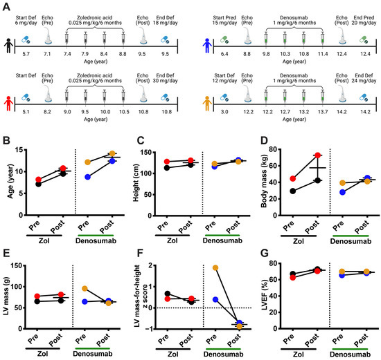 Four boys with DMD, three on deflazacort (Def; black, red, and yellow dots) and one on prednisolone (Pred, blue dots), were treated for approximately two years with either denosumab, a human monoclonal anti-RANKL (1 mg/kg/6 months, n = 2) or zoledronic acid (Zol), a bisphosphonate (0.025 mg/kg/6 months, n = 2) (Figure 6A) to minimize glucocorticoid (GC)-related bone loss. Denosumab and Zol are two FDA-approved antiresorptive treatments. Denosumab acts directly on the RANKL/RANK interaction while Zol blocks farnesyl pyrophosphate synthase, an enzyme important for osteoclast activity [36]. The age at the initiation of treatment varied from one patient to another, as did the dosage, which is based on body weight. Nevertheless, at the time of the second echocardiography, after treatment with denosumab or Zol, the GC to body mass ratios were similar among three of the patients (0.43 mg/kg for the black, red, and blue dots). One patient (yellow dots) had a higher GC to body mass ratio, 0.58 mg/kg (Figure 6A). At the beginning of the study, the denosumab-treated patients were 8 and 12 years old, while the Zol-treated children were 7 and 8 years old (Figure 6B). The children in the two groups were similar in terms of height, while their weight varied prior to and across the treatment period (Figure 6C,D, respectively). One Zol-treated child had a significant gain in weight during the two-year treatment period (Figure 6D, red dots). One denosumab-treated child presented with a high LV mass at the beginning of treatment (Figure 6E, yellow dots). However, once on denosumab, the LV mass declined by 36% (Figure 6E, yellow dots). The LV mass was maintained in the second child with the denosumab treatment (Figure 6E, blue dots). Interestingly, the LV masses of the Zol-treated children were slightly higher at the end of the treatment period (Figure 6E, black and red dots). The LV mass-for-height z scores, which express LV mass relative to the mean of healthy children of the same height, were above 0 for all four children before the treatments, suggesting that they showed signs of LV hypertrophy. Notably, the z scores for the LV mass of the denosumab-treated children diminished markedly below 0 and then remained constant, while they were above 0 in the Zol-treated children (Figure 6F). The ejection fractions ranged from 56 to 78% for all the children, which were normal [37], and remained constant during the treatments (Figure 6G), suggesting that the children did not appear to exhibit symptoms of systolic dysfunction during the observation period.