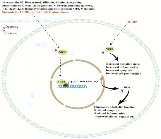 The studies reviewed above suggest that several compounds and cell modulators can regulate the NRF2/KEAP1 pathway. Thus, these compounds may be used in combination with classical therapy to improve the efficiency of the treatment ameliorating/avoiding PE onset.