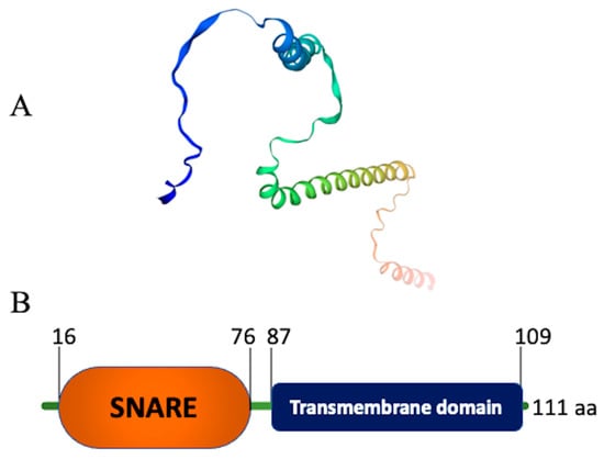 Protein structure of Snc1 of Trichoderma reesei QM6a. (A) 3D structure of SNARE protein Snc1 (created at https://swissmodel.expasy.org (accessed on 7 April 2023)). (B) Schematic representation of Snc1 domains (created at https://smart.embl-heidelberg.de (accessed on 7 April 2023)). SNARE domain is represented in the orange color (residues 16–76) and the trans-membrane domain is represented in the dark-blue color (residues 87–109).