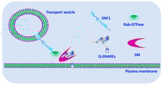 Membrane fusion at the target compartment is facilitated by a group of specialized proteins known as SNAREs (Soluble N-ethylmaleimide-sensitive factor attachment protein receptors). These proteins play a critical role in ensuring the effective and coordinated fusion of the two membranes [5]. The orderly fusion of membranes requires four SNARE proteins, which form a complex via the interaction of their alpha helices. This brings the two membranes in close proximity, with the concomitant expulsion of water molecules between them. The complex formed by this trans-SNARE interaction is known as SNAREpin, while the SNARE proteins involved in this process are classified as either v-SNAREs (which are associated with the vesicle membrane) or t-SNAREs (which are associated with the target membrane) [6]. The membrane fusion is completed by recruiting an R-SNARE and a set of three Q-SNAREs, named after their specific target residues, namely arginine (R) and glutamine (Q), respectively [6,7,8]. SNARE proteins are present on a wide range of membranes, including the PM, Golgi membranes, endosomes, vacuoles, ER, and their derived vesicles [6].