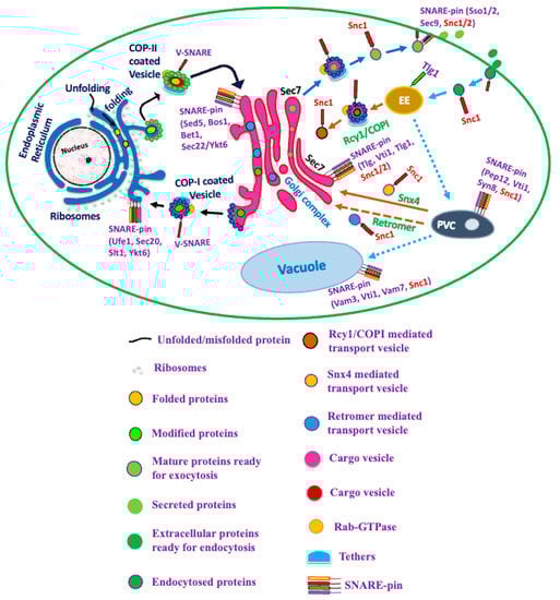 - Best, J.T.; Xu, P.; McGuire, J.G.; Leahy, S.N.; Graham, T.R. Yeast Synaptobrevin, Snc1, Engages Distinct Routes of Postendocytic Recycling Mediated by a Sorting Nexin, Rcy1-COPI, and Retromer. Mol. Biol. Cell 2020, 31, 944–962. [Google Scholar] [CrossRef]