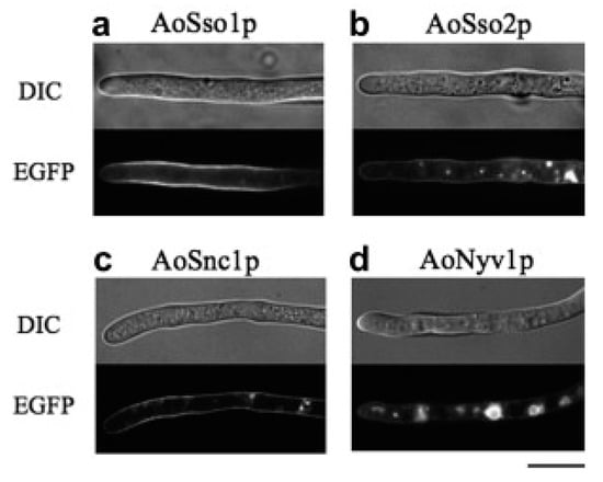 Subcellular localization of Snc1 and related SNAREs of PM in Aspergillus oryzae. DIC and EGFP fluorescence micrographs of strains expressing the fusion proteins of (a) AoSso1p, (b) AoSso2p, (c) AoSnc1p, and (d) AoNyv1p. The bar represents 10 µm. (Reprint from “Systematic analysis of SNARE localization in the filamentous fungus Aspergillus oryzae”, by Kuratsu et al., [71], Copyright (2023), by Elsevier).