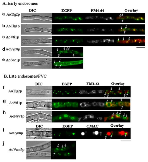 Subcellular localization of the endosome-related SNAREs of Aspergillus oryzae. DIC, EGFP, and FM4-64 or CMAC fluorescence micrographs of strains expressing the fusion proteins of (A) early endosome-resident SNAREs, including (a) AoTlg2p, (b) AoTlg1p, (c) AoVti1p, (d) AoSyn8p, and (e) AoSnc1p, and (B) late endosome-resident SNAREs, including (f) AoTlg2p, (g) AoVti1p, (h) AoNyv1p, (i) AoSyn8p, and (j) AoVam7p. Arrows in (A) indicate early endosomes that show directional movement along the hyphal axis, and arrows in (B) indicate late endosomes that are static and adjacent to vacuoles. The bar represents 10 µm (Reprint from “Systematic analysis of SNARE localization in the filamentous fungus Aspergillus oryzae”, by Kuratsu et al., [71], Copyright (2023), by Elsevier).