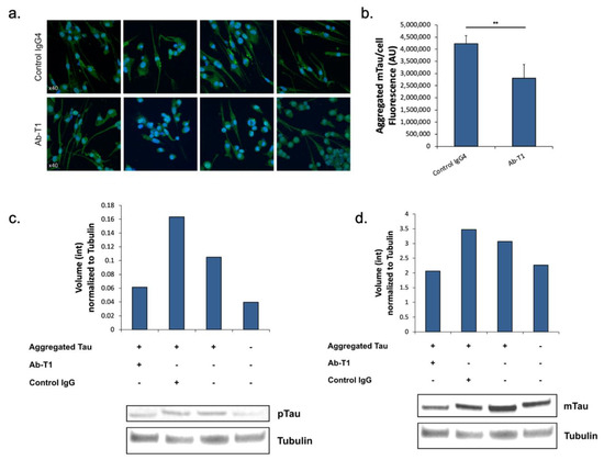 Here, we analyzed and quantified p-Tau protein and total murine endogenous tau protein levels compared to tubulin protein levels in ex vivo brain slices from hTau.K257T/P301S mice treated with Ab-T1 or control IgG. Protein levels of phosphorylated tau or total endogenous tau (mouse tau) normalized to total tubulin levels in hTau.K257T/P301S transgenic mice (AD/Tauopathy) treated with Ab-T1 or hIgG4 were detected and analyzed using Western blot immunoassay (Figure 2c). Brain sections treated with Ab-T1 showed lower levels of tau phosphorylation (Figure 2c—volume intensity = 0.06) compared to control IgG treatment (Figure 2c—volume intensity = 0.16). Furthermore, brain sections treated with Ab-T1 showed lower levels of mouse endogenous tau protein (Figure 2d—volume intensity = 2.06) compared to control IgG treatment (Figure 2d—volume intensity = 3.46).