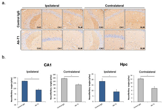 Figure 3. Ab-T1 inhibits seeding and spreading of Tau pathology in vivo. (a) High magnification of hyperphosphorylated, anti-pTau (ser404) antibody-positive tau pathology (neurofibrillary tangles) in the ipsilateral and contralateral CA1, CA3, and striatum lacunosum-moleculare (SLM) region of the hippocampus demonstrating neuritic plaque tau pathology; ×20 (b) quantification of neurofibrillary tangles—tau pathology positive staining cells reveals treatment with Ab-T1 significantly reduced the amount of anti-pTau (ser404)-positive tau pathology on the ipsilateral side, and same trend of reduction of tau pathology is shown on the contralateral side. Ab-T1 treatment group was compared to the corresponding IgG isotype control group (Mann–Whitney U test; * p < 0.05). In order to obtain composite average of tau pathology in brain slices, cells from six adjacent blocks of tissue were quantified.