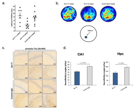 Figure 4. Cognitive decline assessment using Morris water maze test and reduction of neurofibrillary tangles in the brain. (a) Control IgG-treated hTau.K257T/P301S mice compared to Ab-T1-treated mice showed cognitive impairment as indicated by the increase in latency to platform in the MWM probe test. (b) Heat map average group images of time mice spent in different areas of the MWM pool. Error bars represent standard error of the mean. (c) Immunohistochemical images of neurofibrillary tangles in hippocampal area (CA1 and CA3). (d) Total number of neurofibrillary tangles in both control IgG and Ab-T1 treatment groups in hippocampus and CA1 (Hpc, two-tailed Student’s t test, p = 0.040), (CA1, two-tailed Student’s t test, p = 0.014). Magnification ×20.
