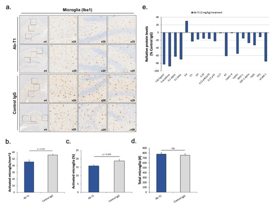 Figure 6. Ab-T1 reduces the number of microglia activated in the brain. (a) Activated microglia in hippocampal area (b) measured as a percent of total microglia. (c) Total activated microglia average in sagittal brain slice area. (d) Total number of microglia in both control IgG and Ab-T1 treatment ((b), Two-tailed Student’s t test, p = 0.044); ((c), two-tailed Student’s t test, p = 0.024). Magnification ×4, ×20. (e) FAS ligand, Fractalkine, IL1-alpha, IL1-beta, IL4, IL5, IL6, IL10, IL12-p40/p70, IL17, KC, Leptin R, Leptin, MCP-1, SDF-1 alpha TARC TPO, and VCAM-1 protein levels were detected using a mouse cytokine antibody array chip in purified brain homogenates in Ab-T1 compared to control IgG treated mice. The y-axis represents the relative % of normalized protein levels in Ab-T1-treated group relative to control IgG-treated group (read as signal intensity output from microarray fluorescence scanner). n = 5, 5.