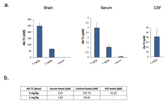 Ab-T1 levels in the CSF, brain, and serum of mice were measured using a human IgG4 Elisa detection kit (Figure 7a). Figure 7b summarizes in the table the detectable levels of Ab-T1 in serum, cortex, and CSF of mice treated with two different doses of Ab-T1 (1 or 5 mg/kg).